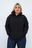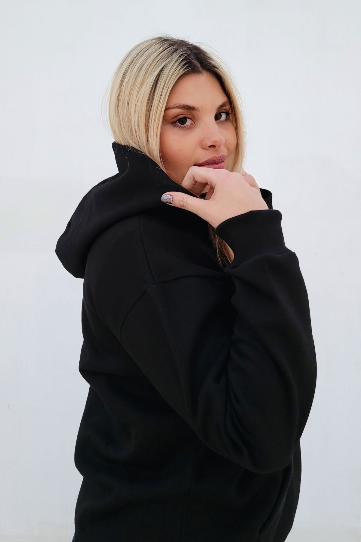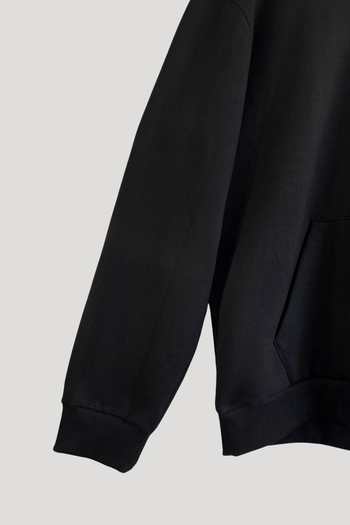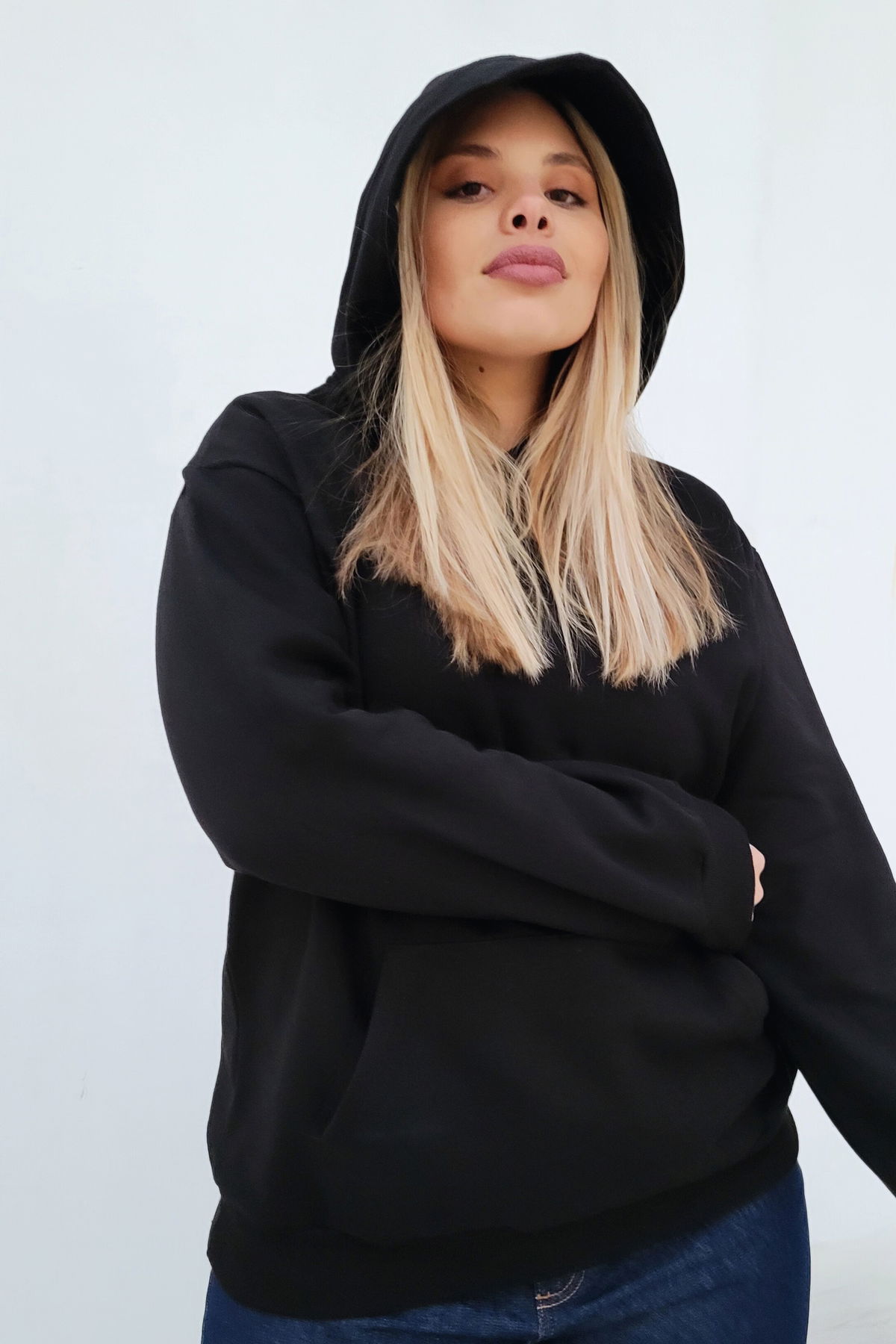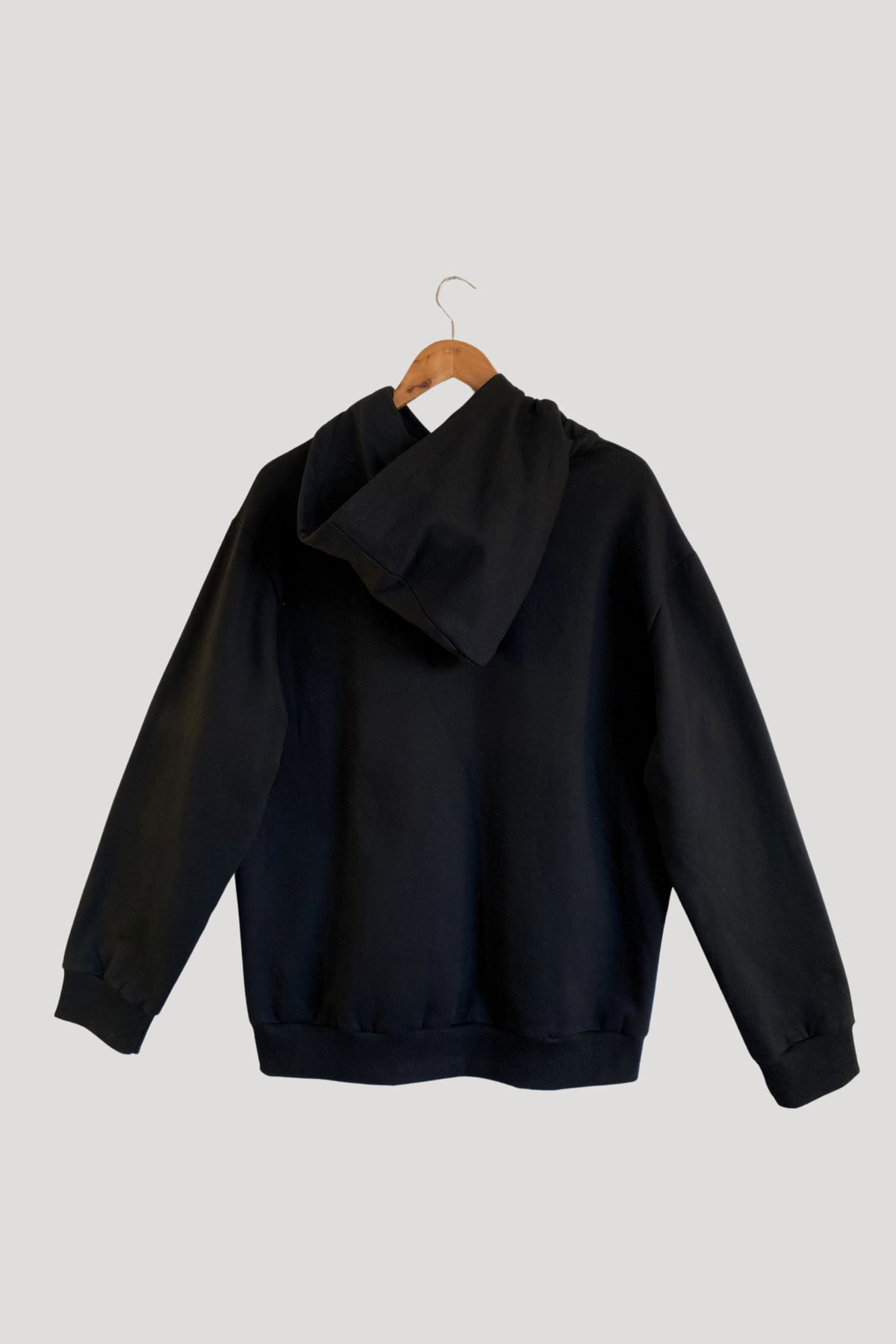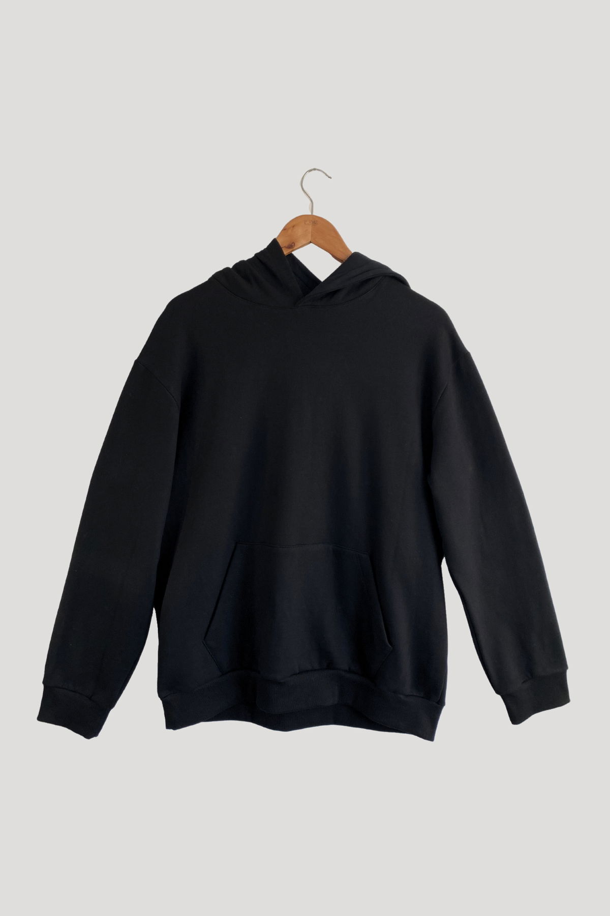 Puños de rib, mangas hombro caído y bolsillo frontal.